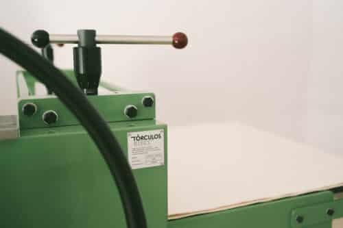 Con rodillos de 215 mm de diámetro y una altura máxima de 52 mm entre rodillo y platina, este tórculo garantiza una presión uniforme, ajustable mediante un husillo M30 de paso fino. La estructura robusta, con un peso total de 489 kg y dimensiones compactas de 1190 x 1500 mm, hace de este equipo una excelente opción para talleres de grabado profesionales.
